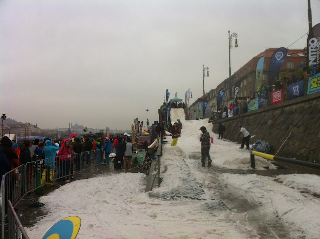 I told BW he'd spy celebs in Prague; it was only a matter of time before it happened. There were supposed to be some famous Czech snowboarders at a winter sports event last weekend, but we could have stepped on one's toes and wouldn't have recognized him/her. The event was cool, though; a big snow ramp was constructed on the riverbank and there were a couple kilometers-worth of merchandise and food tents.